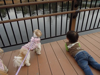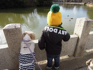 カルガモを一緒に見つめるもことむぅくん