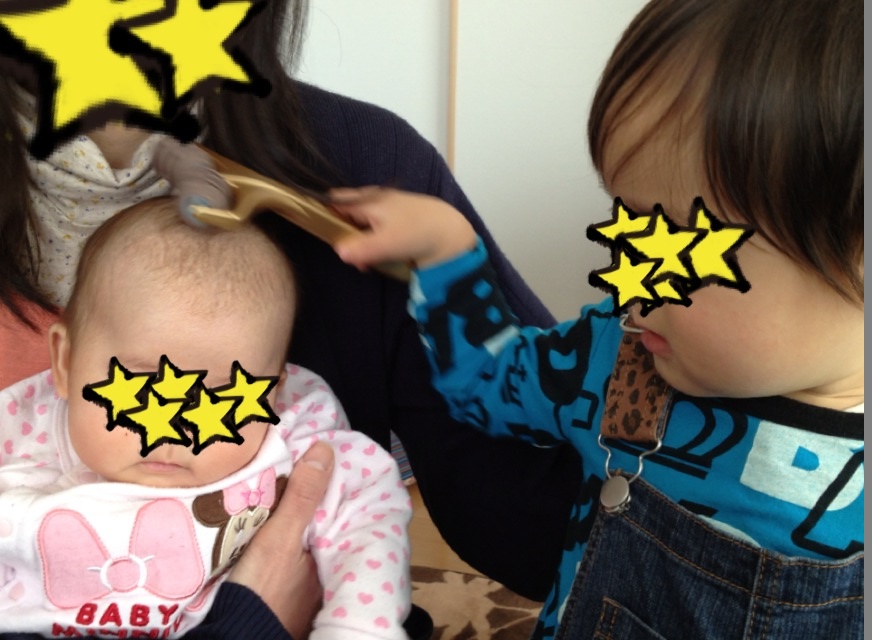 美顔ローラーでめいちゃんの頭をころころするむぅくん