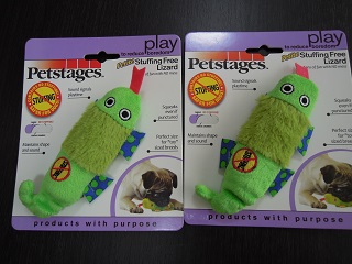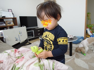 このトカゲを見て、色の似た自分のカエルのぬいぐるみを