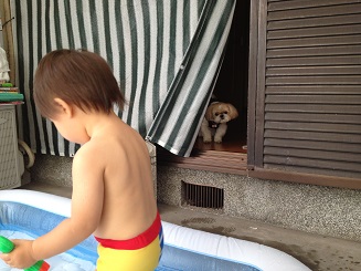 プールしてるむぅくんを、隙間から覗いてるもこがかわいすぎ