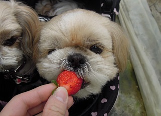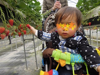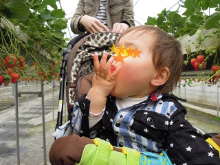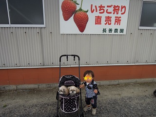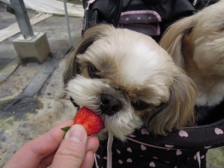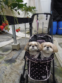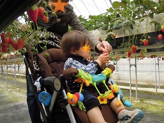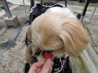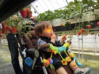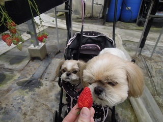 私が、もこみくのカート押しながら、いちごを食べていると。。。