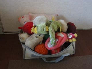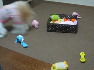 おもちゃ入れごと移動させて、色んなおもちゃを散らかしまくり~
