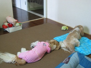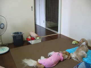 もこも、扇風機の風が来る所で寝そべってました