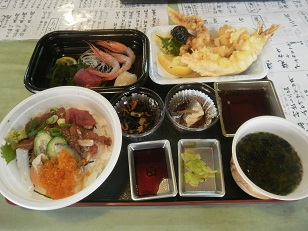 海鮮どんぶり、お刺身、天ぷら、お味噌汁、小鉢2種のセット