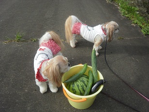 朝のお散歩に行きがてら、野菜をもぎ取りに行くことに