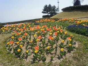 風車とたくさんのチューリップが見えてきました
