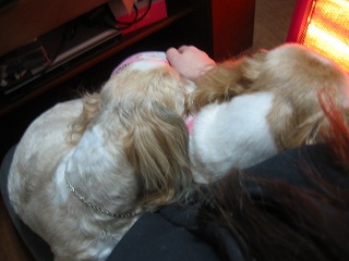 もこは、PCに向かうダーリンの膝の上でお昼寝