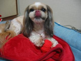 おもちゃそっちのけで、ブランケット噛んでるがな
