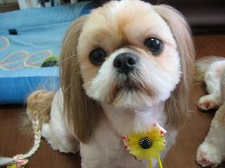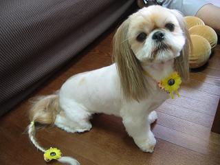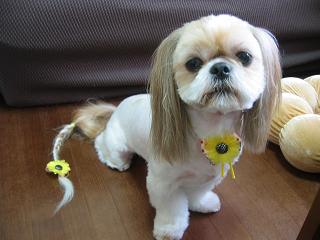 今回は、ひまわりの大きなリボンを、首としっぽに
