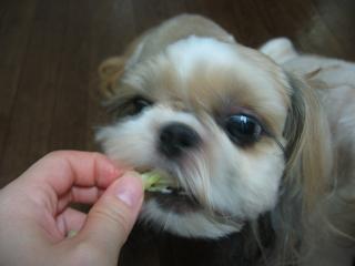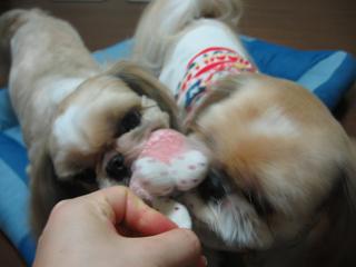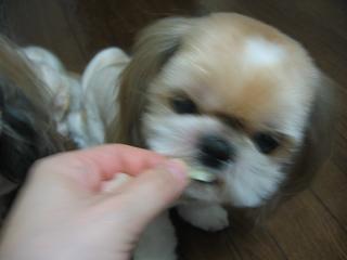 いつもお散歩に行く前に、もこみくはおやつを少し食べるので、