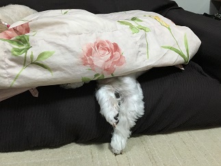 いつも、もこはお布団の中、みくはお布団の上で