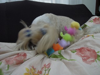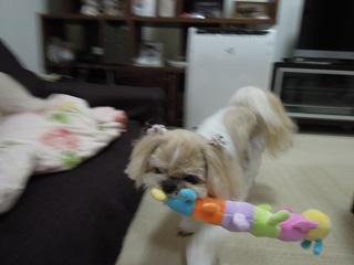 仕事から帰った時とか、喜んでおもちゃをくわえて走り回るところ