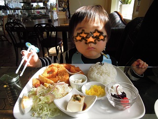 そして、海鮮市場でハンバーグセットを食べる坊ちゃん(笑)