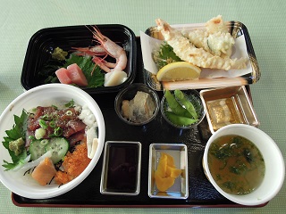 海鮮丼にお刺身、天ぷら、小鉢、お味噌汁のセット