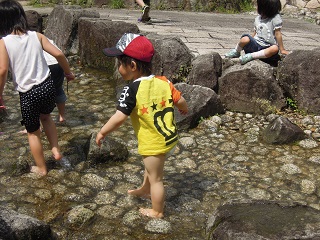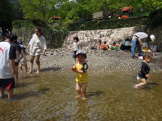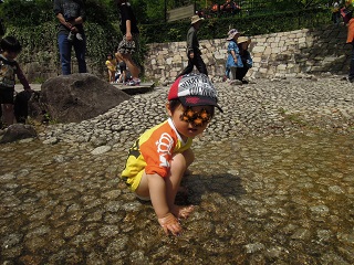 ここの公園で、小川で水遊びができるとか知らなかったので、