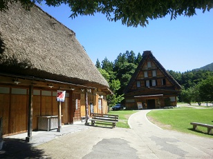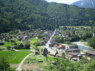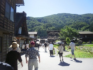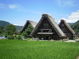 『世界遺産 白川郷合掌造り集落』という石碑の前で